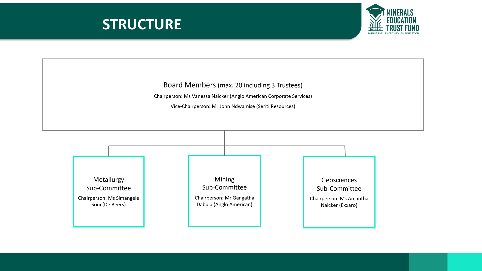 The Trust Fund grew out of the Chamber of Mines Education Fund but is now a completely independently constituted Fund. However the Head of Skills Development at the Minerals Council is an in invitational Board member thus ensuring alignment between the word of the METF and the Council.